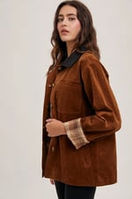 Corduroy button-down barn coat with inner plaid print. This rugged coat features a classic button-down front and is crafted from soft, durable corduroy. The inner plaid print adds a touch of vintage charm and warmth. Perfect for layering over casual outfits, this versatile coat is ideal for outdoor activities or adding a rustic touch to your everyday look.