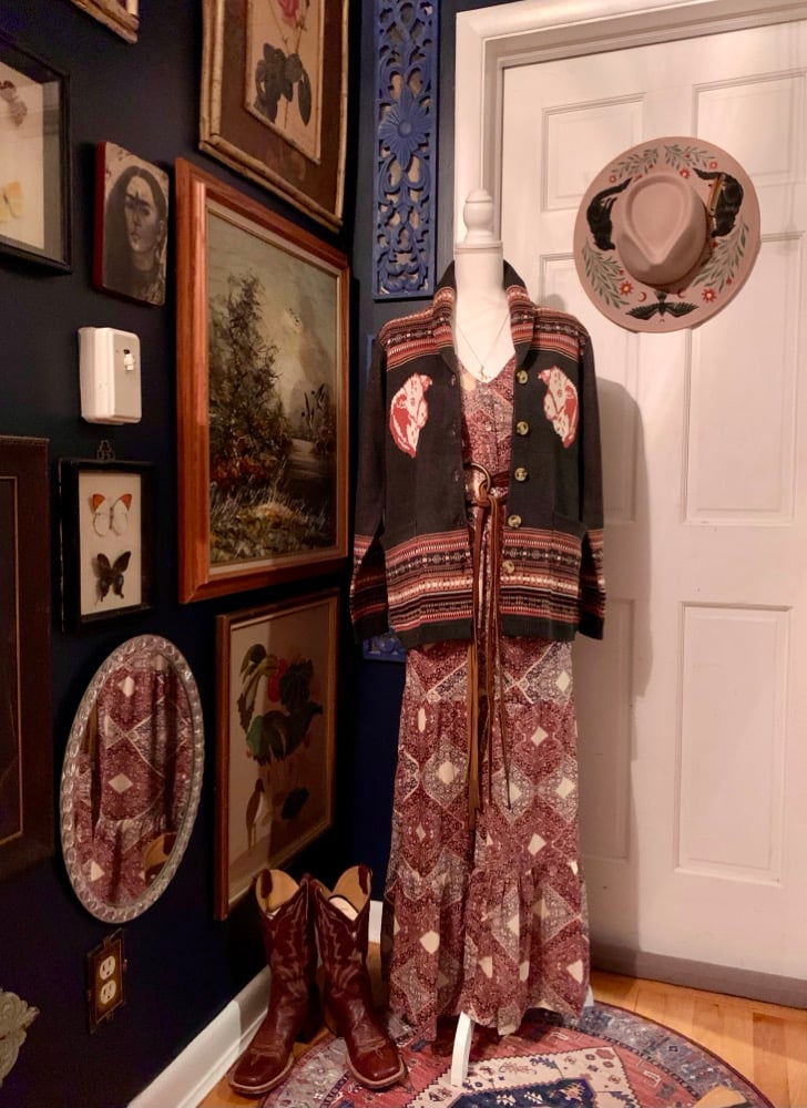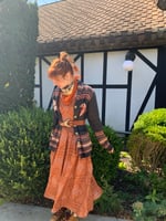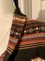 Coal grey Grandpa sweater with tortoise button. Lapel collar, and burnt orange and brown pattern. Bull design on front and back. True to size