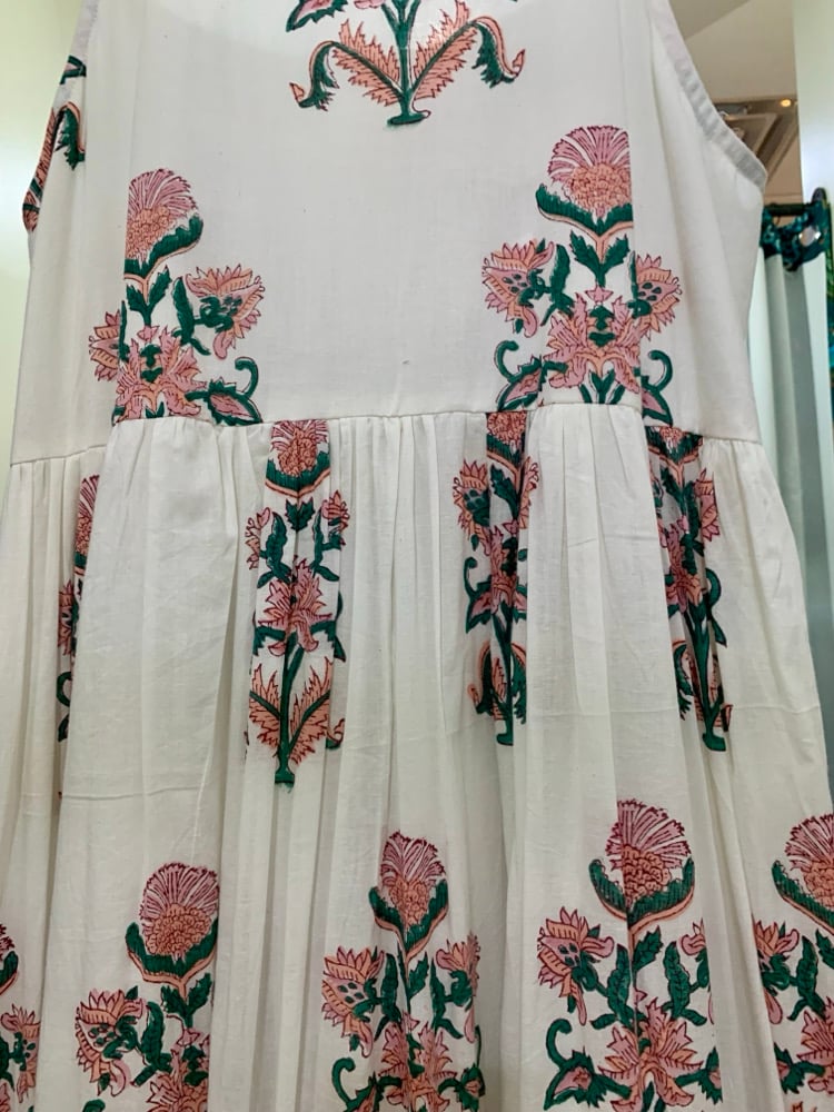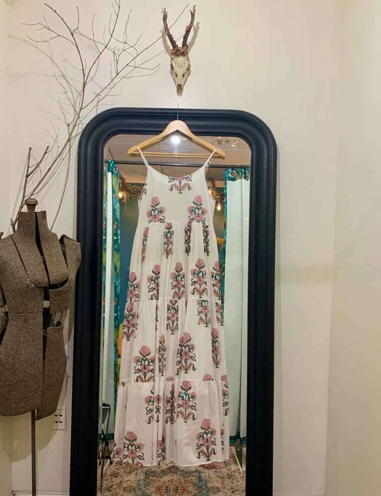 Strappy, tiered dress made from 100% cotton. Hand-block printed using low impact, eco-friendly dyes. Adjustable shoulder straps. A favorite for all of your effortless days!