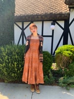 A printed woven midi dress featuring square neckline, long sleeve with smocked cuff, full skirt and smocked back bodice. True to size