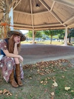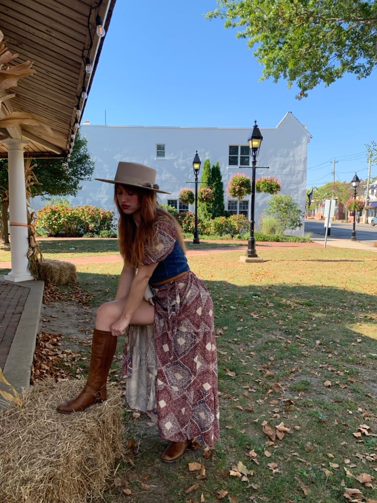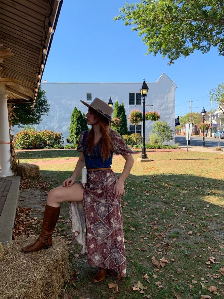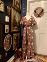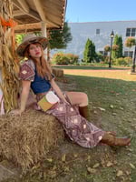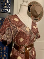 Cotton maxi in stained glass America pattern. Full button down, puff cap sleeve and matching belt. Runs full, if in between sizes, size down one size.